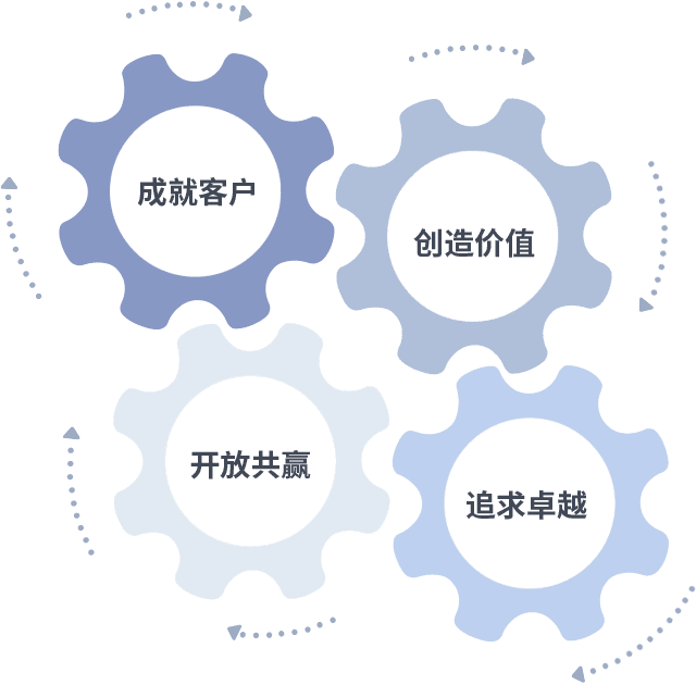 成就客户是一切决策的出发点,,,,创造价值是衡量所有工作的标准,,,追求卓越是我们做事做人的态度,,,开放共赢是我们的格局也是最终的结果。。价值观的齿轮环环相扣,,推动着组织里的每个人不断向前。。